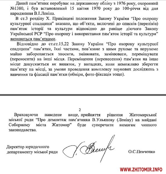 И подан был проект решения намного раньше «немного сенсационного» заявления мэра, т.к. 28 мая юридический департамент Житомирского горсовета уже направил депутату-свободовцу Сергею Онищуку свои замечания. В частности, о том, что памятник Ленину на площади Соборной включен в Перечень памятников Украины, охраняемых государством, его нельзя демонтировать, а переносить можно только в исключительных случаях.