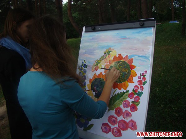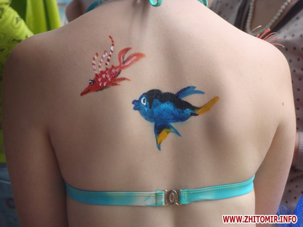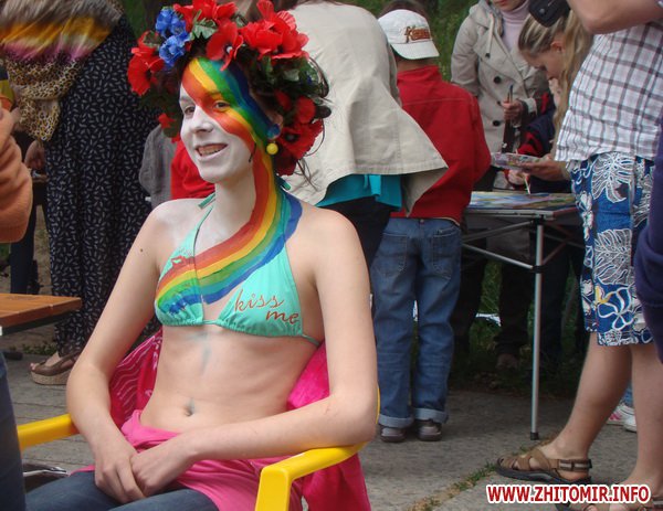 Пасмурная погода не помешала нескольким десяткам житомирян прийти на праздник красок и поучаствовать в конкурсе в качестве модели. В течение нескольких часов профессиональные художники разрисовывали моделей боди-арта яркими красками, создавая образы русалок, бабочек, аватаров и других сказочных героев.