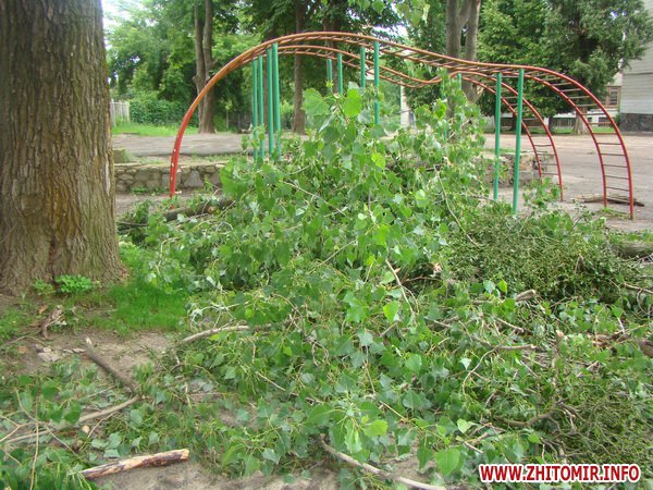 Сильный ветер также повредил несколько деревьев в городе. Так, возле лицея №25 на ул. Малая Бердичевская, 18 ветки нескольких деревьев упали просто на детскую спортивную площадку и погнули металлические лестницы и турники.