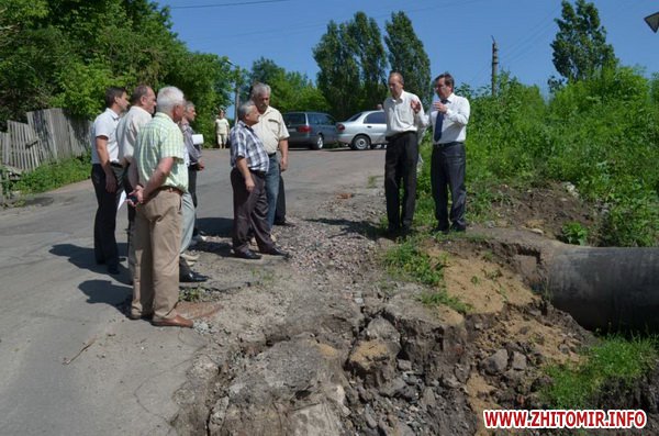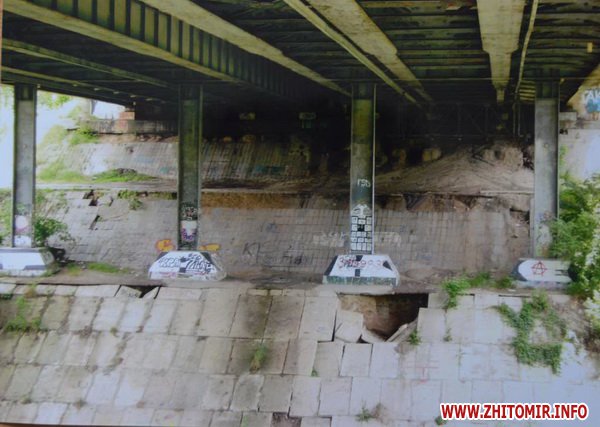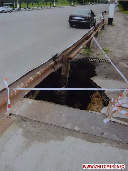 В Житомире на мосту по проспекту Мира на тротуаре провалился асфальт. Тротуар разрушился вследствие сильных ливней и интенсивных потоков дождевых вод. В городе создали специальную комиссию, которая сейчас изучает техническое состояние места провала, проводится анализ причин, также ликвидировано розмыв.