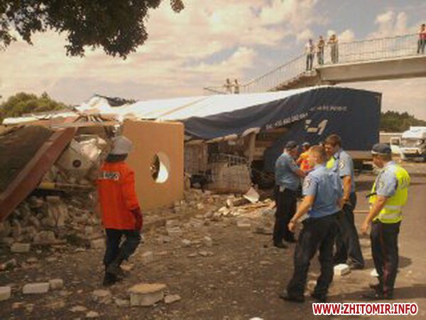 Как сообщил Житомир.info свидетель аварии Максим, 25 июня около 11.00 фура, груженная емкостями з жидкостью, двигаясь в направлении Киева, влетела в новую автобусную остановку в селе Кмитов. Грузовик полностью развалил остановку. Водителя зажало в кабине. Сейчас работники МЧС пытаются его вытащить.