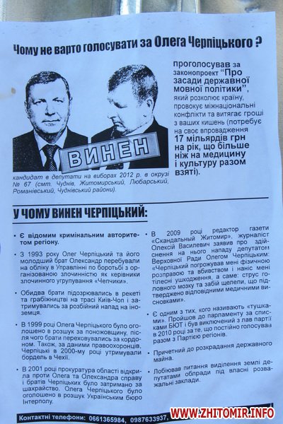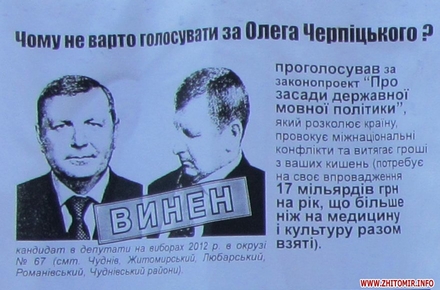 Кстати, в листовке сказано, что Черпицкий – кандидат в депутаты на выборах 2012 года по округу № 67 (смт Чуднов, Житомирский, Любарский, Романовский, Чудновский районы).