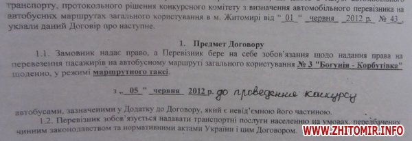 У частного перевозчика Владимира Петюха есть договор на перевозку пассажиров по маршруту №3. Договор был заключен 5 июня 2012 года и действителен «до проведения конкурса».