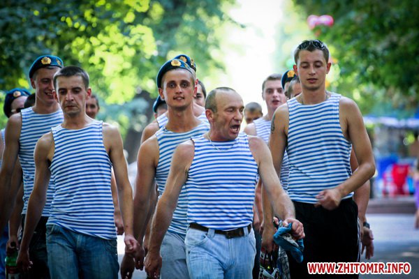 В житомирском парке культуры и отдыха им. Ю. Гагарина десантники весело купаются в фонтанах, выпивают, встречают своих боевых товарищей и в общем веселятся.