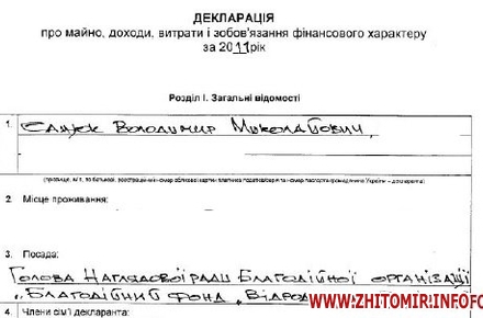 Согласно поданной кандидатом в народные депутаты по округу №62 (Житомир) Владимиром Сацюком декларации за 2011 год, его общий совокупный доход составляет 2 млн. 308 тысяч 358 гривен. Это деньги, полученные в качестве подарка, приза или выигрыша. Других доходов у Сацюка и членов его семьи в 2011 году не было.