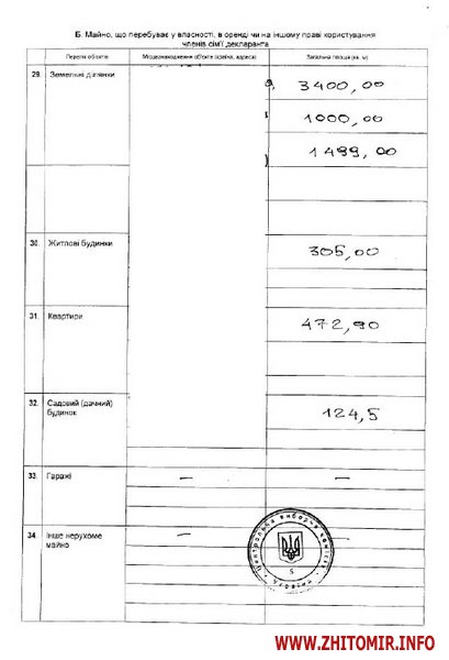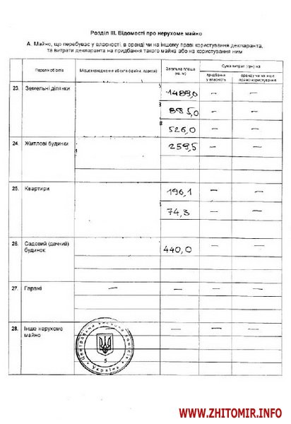 Владимиру Сацюку принадлежит: три земельных участка общей площадью 2910 кв.м, жилой дом общей площадью 259,5 кв.м, две квартиры – 196,1 кв.м и 74,3 кв.м., дачный дом общей площадью 440 кв.м, гараж 21 м2. В распоряжении членов семьи кандидата: три земельных участка общей площадью 5899 кв.м., жилой дом общей площадью 305 кв.м., квартира – 472,9 кв.м., дачный домик площадью 124,5 кв.м.