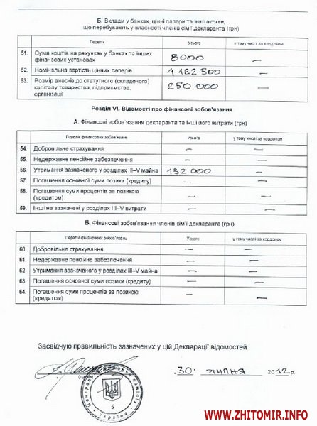 На счетах у членов семьи кандидата находится 80 тыс.грн., номинальная стоимость ценных бумаг - 4 млн. 122 тыс. 500 грн. Размер взносов членов семьи в уставные фонды обществ, предприятий, организаций в 2011 году составил 250 тыс. грн.