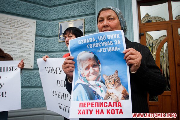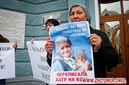 По словам свободовцев, они пытаются отстоять права житомирянки, инвалида 2-й группы, инвалида войны. Женщина, доверившись незнакомому человеку, попала в беду. Рабочий, который делал ремонт в ее доме, украл документы на право собственности и лишил жилья.