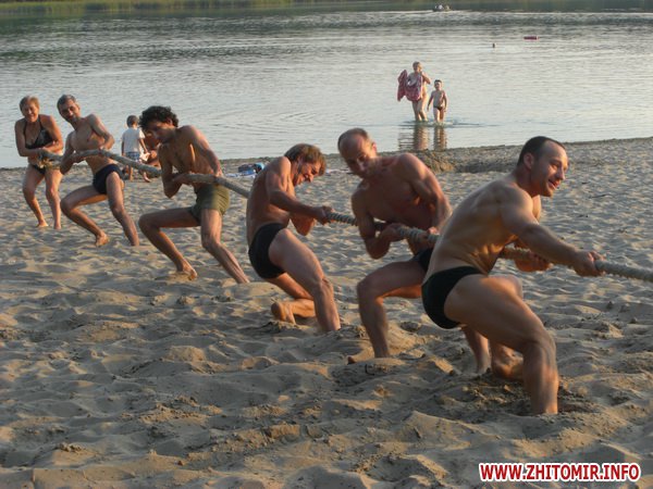 У іншій частині пляжу під запальну музику ді-джея проводились веселі конкурси по перевірці житомирян на спритність, швидкість та злагоджену роботу команди. І малий, і дорослий весело стрибали у мішках, чавили кульки, бігали з водою у долонях та перетягували каната.