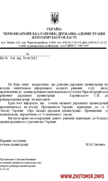 Незважаючи на те, що постанова суду внесена до Єдиного реєстру судових рішень за № 24719572 ще 15 червня, в Червоноармійській РДА жодною інформацією про суд не володіють. Саме так повідомив один із заступників Карпінського – Сапонюк.