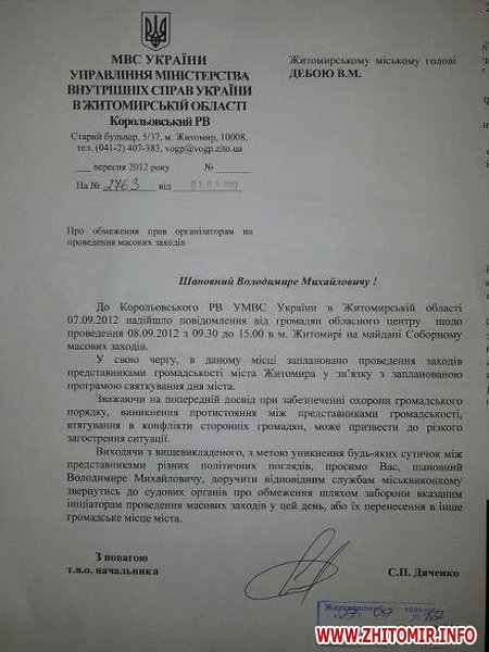 Запретить акцию просили Житомирский горсовета и УМВД Украины в Житомирской области, которые считают, что «проведение празднования Дня города и акции «Защитим ТВі» может привести к конфликту и стычкам между участниками».