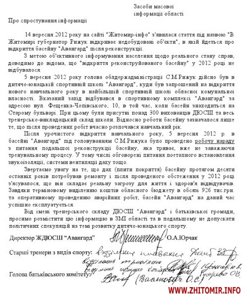 Житомирська дитячо-юнацька спортивна школа «Авангард» Житомирської обласної ради вимагає спростувати інформацію щодо відкриття губернатором Сергієм Рижуком незавершеного об’єкту.