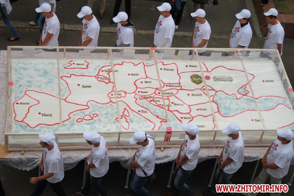 Вага спеченого в Києві бісквітного торту, на якому кулінари кремом зобразили Бердичів центром Європи, була 350 кілограм, довжина – 5 метрів, ширина – 2 метри. Такого в Бердичеві ще не бачили. Роздавали його всім охочим майже півтори години.