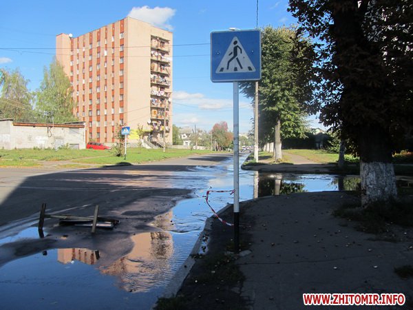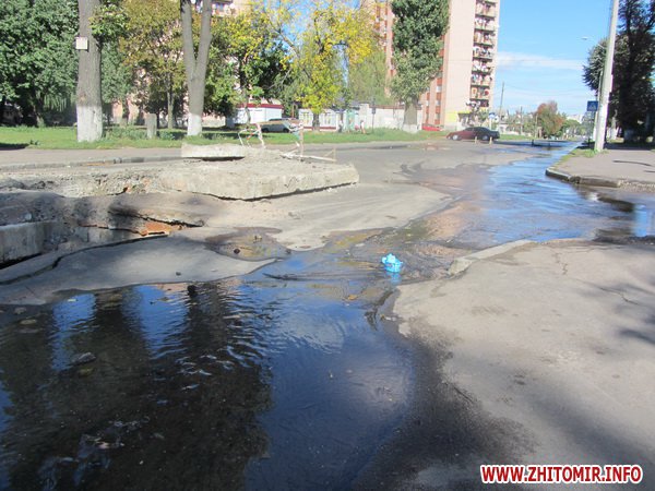 22 сентября в Житомире по улице Шевченко прорвало водопровод. Вода вытекает из закрытого канализационного люка на проезжей части и уже, практически, затопила перекресток, который находится в 50 метрах от места порыва. Более того, очевидно, вода подмыла грунт и поэтому пробивается сквозь трещины в асфальте и вдоль бордюров.