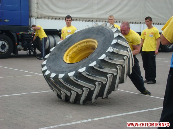 З першого ж конкурсу стронгмени («сильні чоловіки» - одна з назв «Богатирських ігор») захопили увагу вболівальників. 20 тонний автомобіль спортсмени мали перетягнути на найбільшу відстань за визначений час. Першим за жеребкуванням змагався голова Житомирської федерації стронгменів Дмитро Мєшков. Після того, як всі учасники змагань спробували свої сили, ведучій запропонував перетягнути вантажівку всім бажаючим, але серед глядачів таких не виявилось.