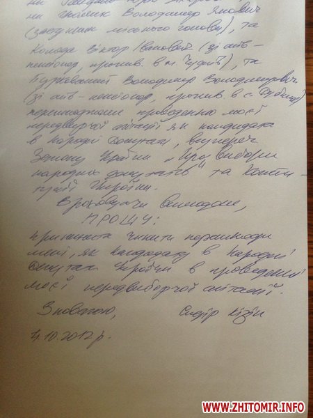Сидір Кізін звернувся до Чуднівського міського голови та прокуратури Житомирської області з вимогою припинити незаконні перешкоди у передвиборчій агітації.