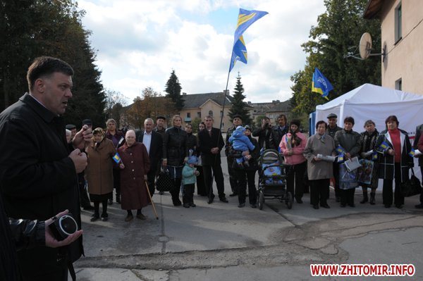 11 жовтня лідер ВО «Свобода» Олег Тягнибок разом з єдиним кандидатом від опозиційних сил в окрузі 67 Сидором Кізіним перебував із робочим візитом у Житомирській області. Він зустрівся із громадами Чуднівського району, Житомира, Бердичева.