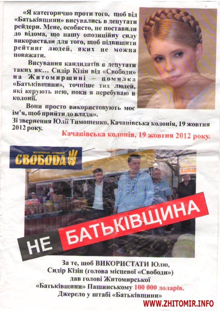 Днями на території виборчого округу №67 були виявлені листівки без вихідних даних, направлені на дискредитацію кандидата у депутати від опозиції Сидора Кізіна. Кольорові листівки на дорогому папері вартістю в сотні тисяч гривень містять фальшиві звернення від імені Юлії Тимошенко, а також заклик до ветеранів не голосувати за Сидора Кізіна.