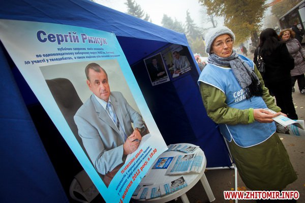 До речі, в агітаційних наметах Рижука з’явилися плакати з інформацією про те, що кандидат «публічно запросив своїх опонентів по одномандатному виборчому округу №62 (м.Житомир) до участі у теледебатах».