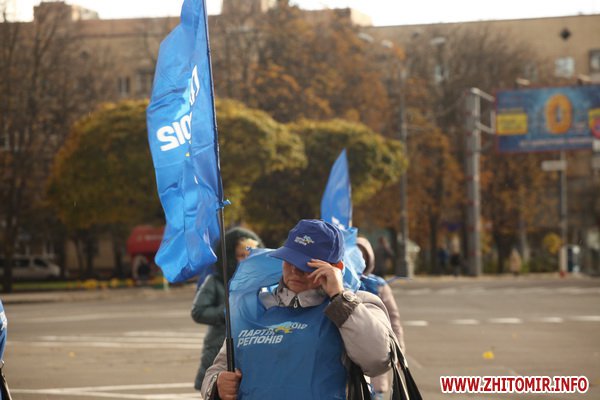 На огромной площади немноголюдно. На сцене выступают малоизвестные исполнители, выступление которых смотрят около двух сотен агитаторов "Партии регионов". Они одеты в жилетки ПР и держат в руках зонтики, на которых написано "Партия регионов 2012".