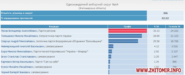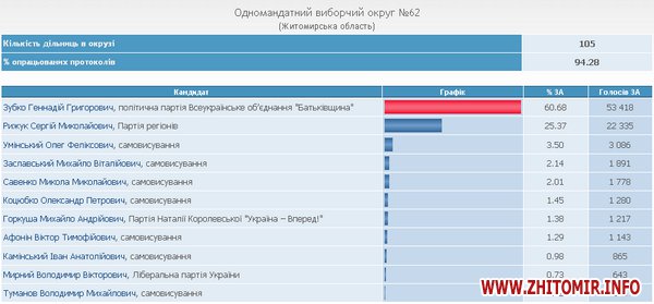 По данным ЦИК, в округе № 62 (Житомир) лидирует кандидат от оппозиции Геннадий Зубко, а в округе № 64 (Коростень) явным фаворитом является кандидат от Партии регионов Владимир Пехов.