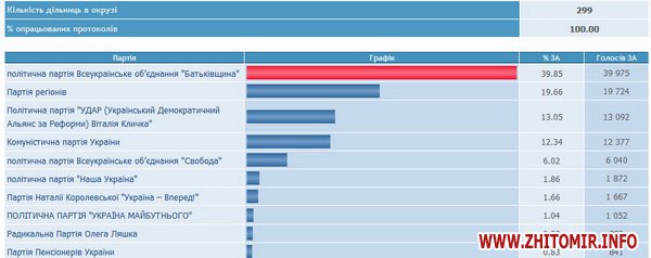 По данным сайта ЦИК победил кандидат от Партии регионов Виталий Журавский – 24,86% (24 756 голосов). На втором месте представитель ВО «Батькивщина» Евгений Добряк – 21,86% (21 768 голосов). Третью строчку занимает кандидат от «Народной партии» Николай Рудченко – 20,98% (20 886 голосов).
