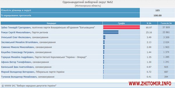 Центризбирком обработал 100% протоколов по избирательному округу №62 (Житомир).