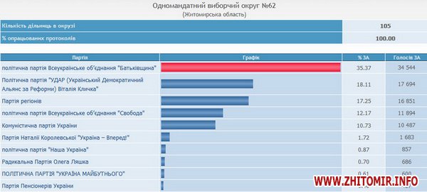 Проходной барьер в Верховную Раду по округу №62 преодолели пять партий: ВО «Батькивщина» - 35,37%, УДАР – 18,11%, Партия регионов – 17,25%, ВО «Свобода» - 12,17%, КПУ – 10,73%