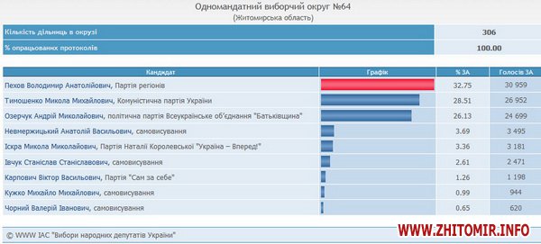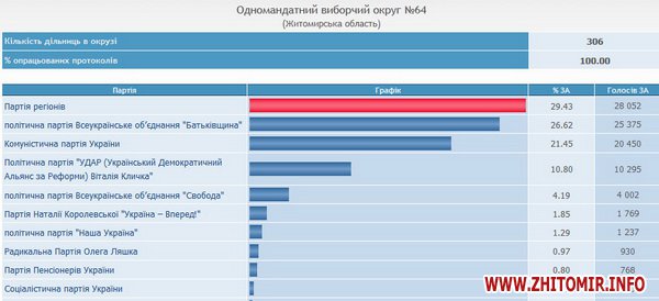 Проходной барьер в Верховную Раду по округу №64 преодолели четыре партии: Партия регионов – 29,43%, ВО «Батькивщина» - 26,62%, КПУ – 21,45%, УДАР – 10,8%.