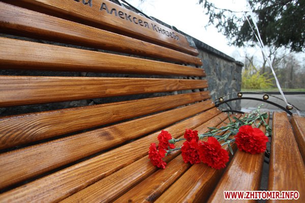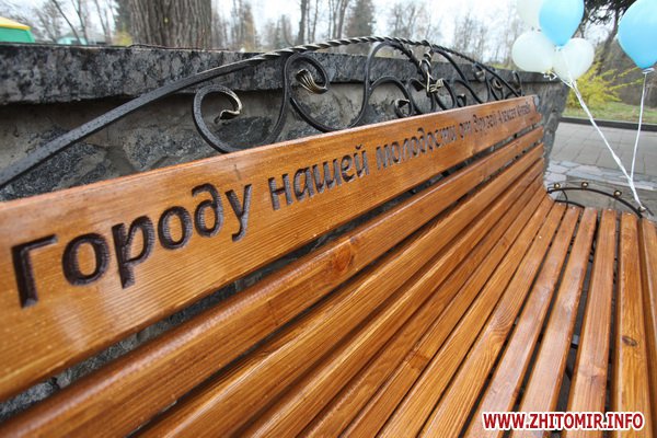 На одной лавке выгравировано "Городу нашей молодости от друзей Алексея Князева", а на второй "Посвящается легенде житомирского бокса Владимиру Кирилюку".