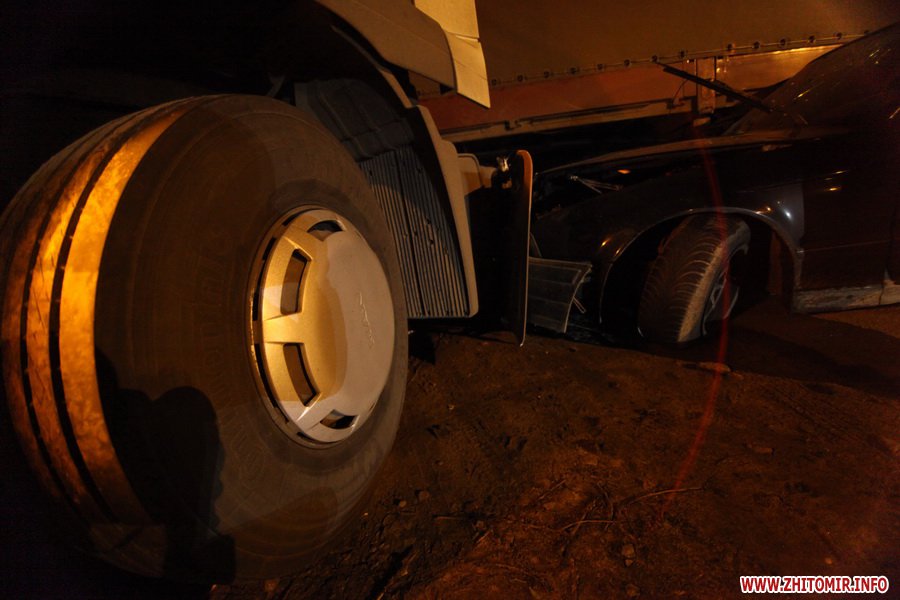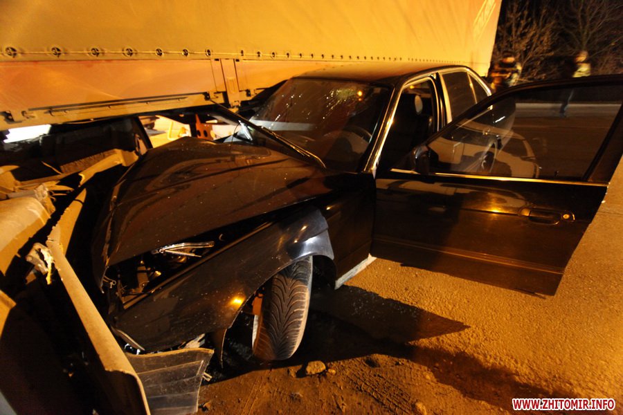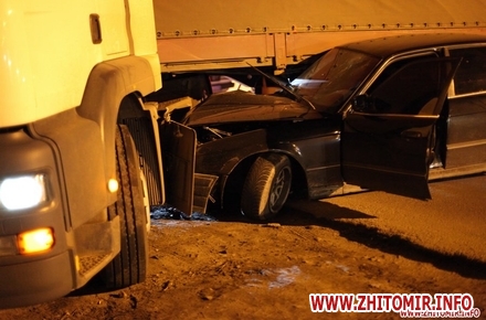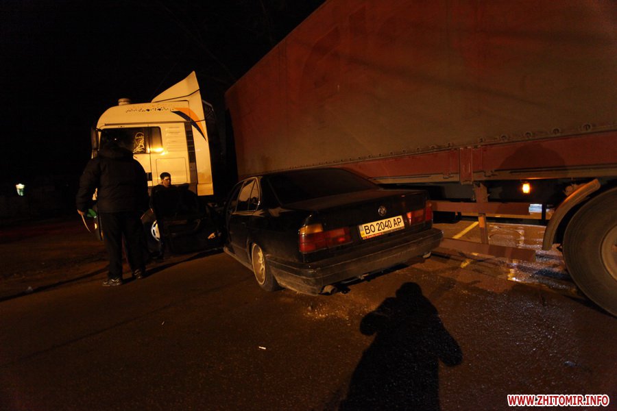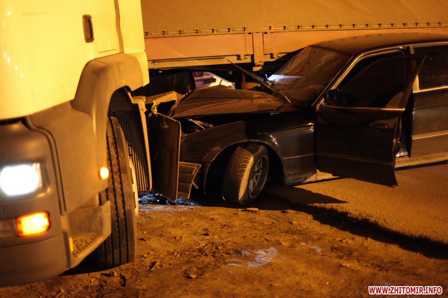 Грузовой автомобиль с прицепом двигался в сторону выезда из Житомира, а BMW ехала во встречном направлении, в сторону автовокзала, и втаранилась прямо в бензобак фуры.