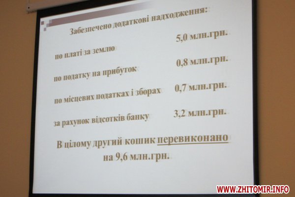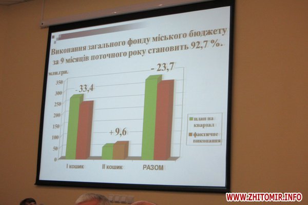 По информации департамента бюджета и финансов Житомирского горсовета, за 9 месяцев 2012 года выполнение общего фонда городского бюджета составляет 92,7%, в том числе: поступления в І корзину меньше плановых на 33,4 млн.грн., поступления во ІІ корзину – больше на 9,6 млн.грн.