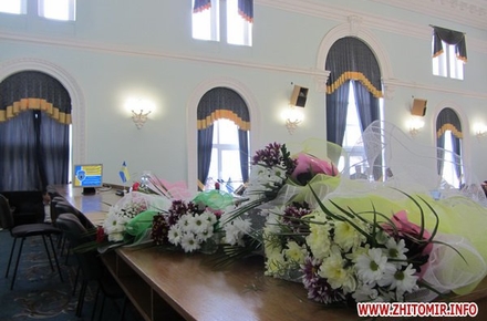 Заседание началось с поздравлений по случаю Дня местного самоуправления: мэр Житомира Владимир Дебой вручал грамоты, цветы и благодарности. Грамоту Житомирского облсовета и ценный подарок (часы) получили депутаты Неля Ковалюк («Фронт Змін») и Владимир Шуст (Партия регионов).