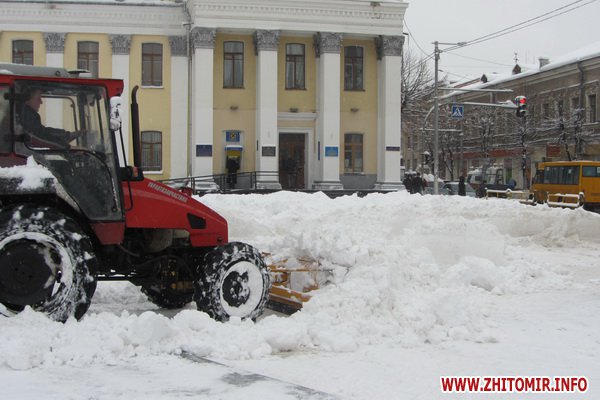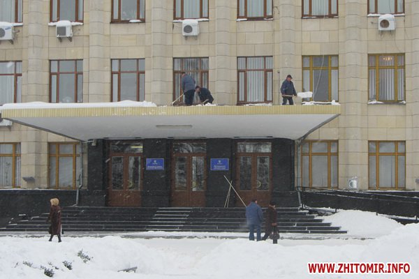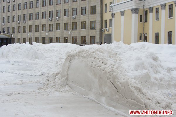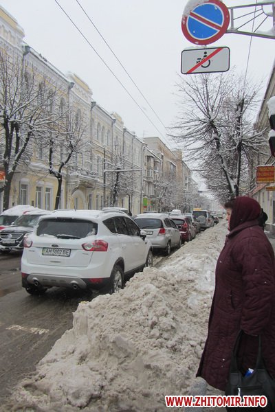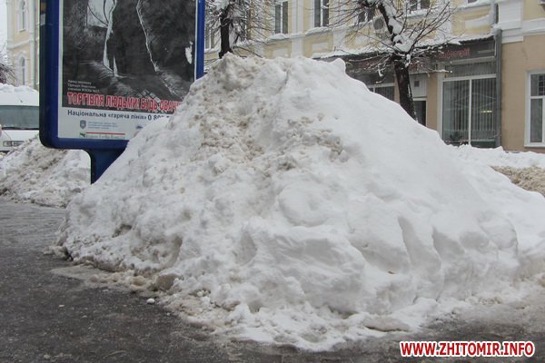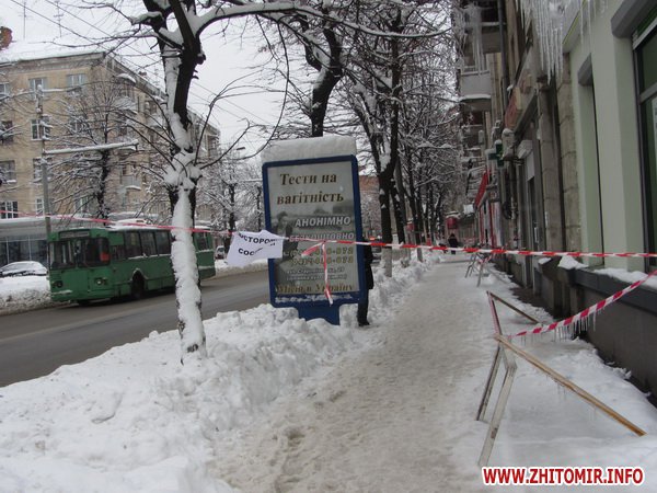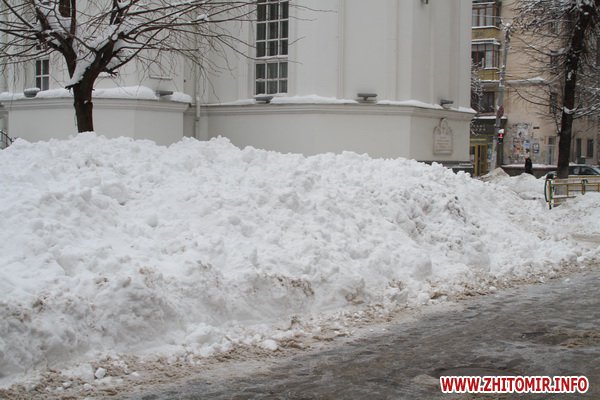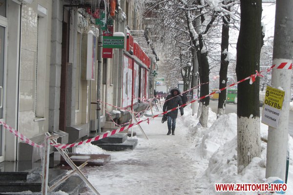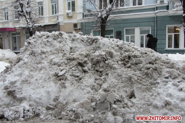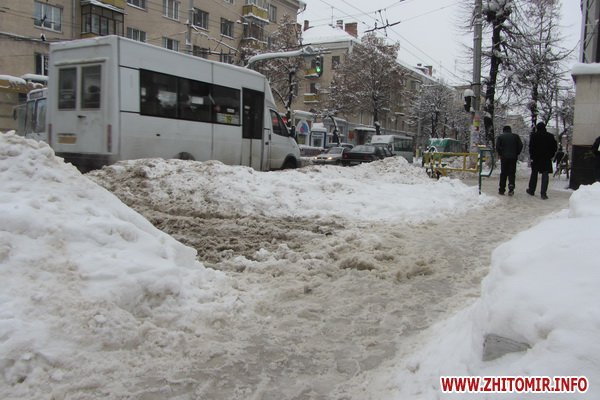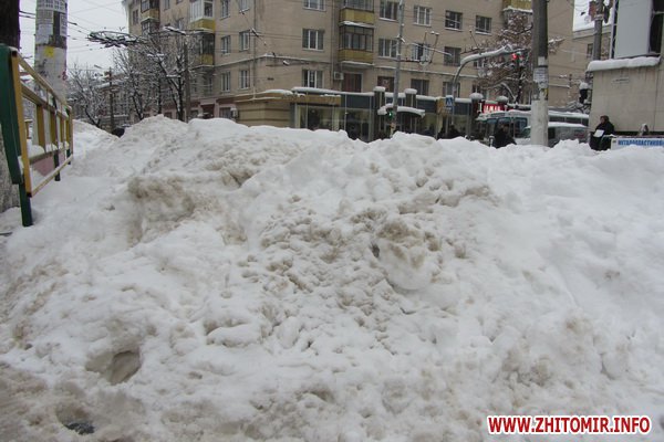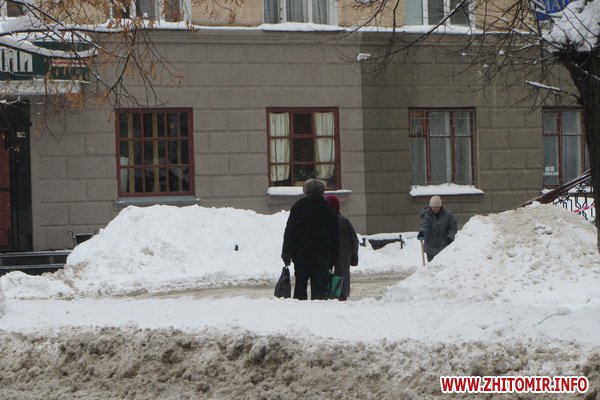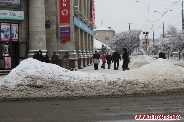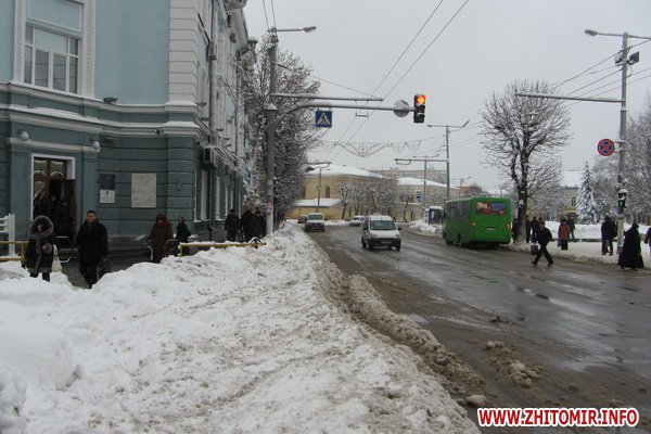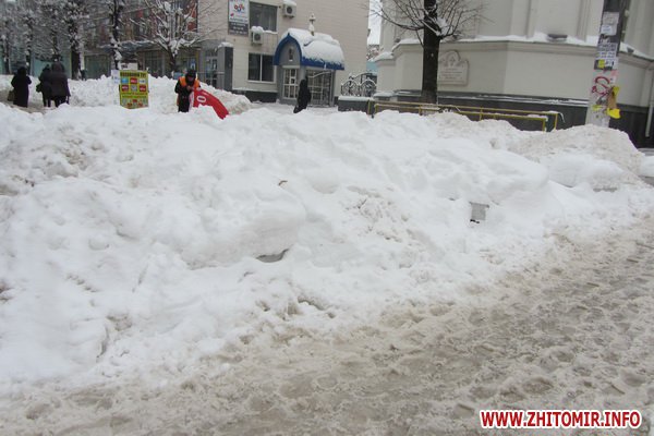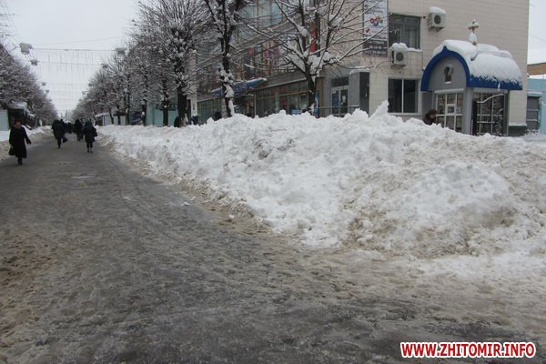 12 декабря в Житомире прекратился снегопад и центральные улицы города завалены кучами снега. На ул.Киевская житомиряне вынуждены ходить под ограждением невзирая на угрозу падения сосулек, т.к. другой возможности пройти по тротуару нет. Также в центре города, на перекрестке улиц Киевская-Михайловская люди ходят по узкой скользкой тропинке между кучами снега.