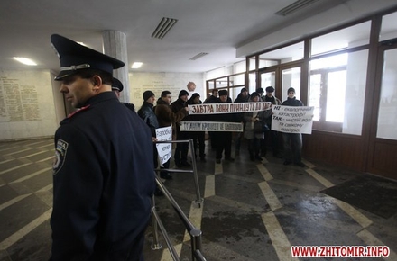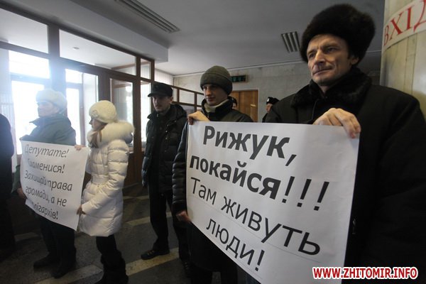 20 декабря несколько десятков людей с плакатами встречали в фойе здания на площади Королева депутатов, которые шли на сессию облсовета.