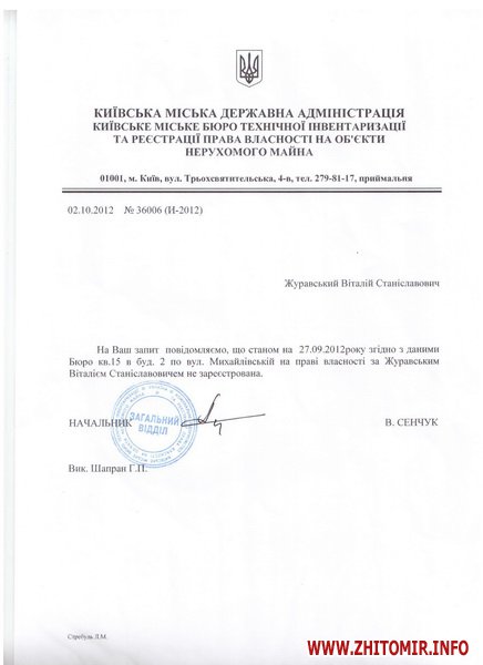 Інформація про те, що Журавський має квартиру на вулиці Михайлівській в Києві, неодноразово спростовувалася. Ще 2 жовтня 2012 року Київське міське державне бюро технічної інвентаризації повідомило, що квартира на праві власності за Журавським не зареєстрована (копія документу додається).