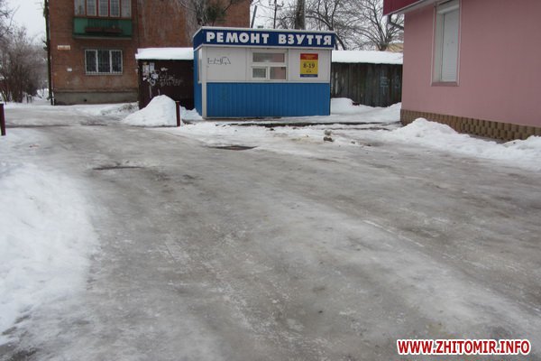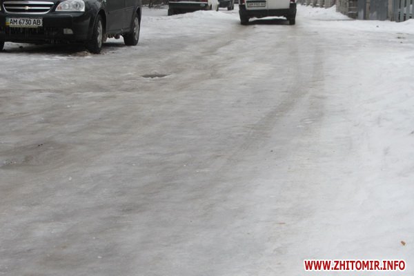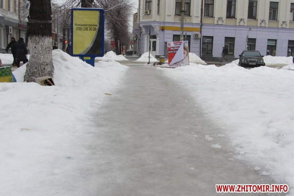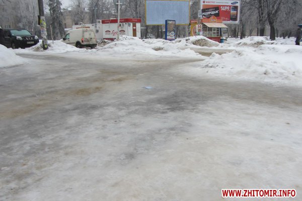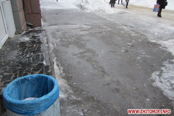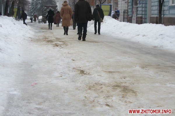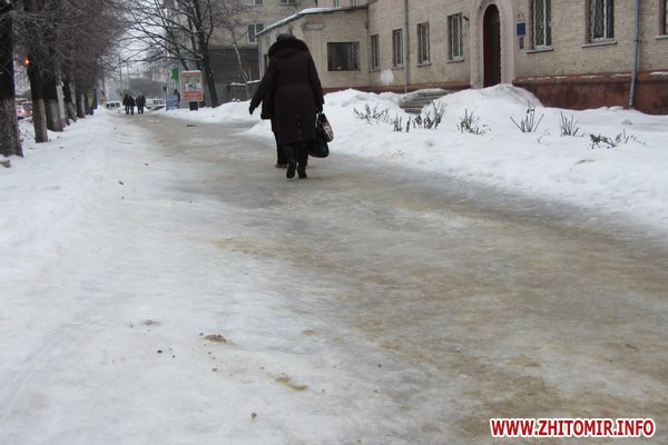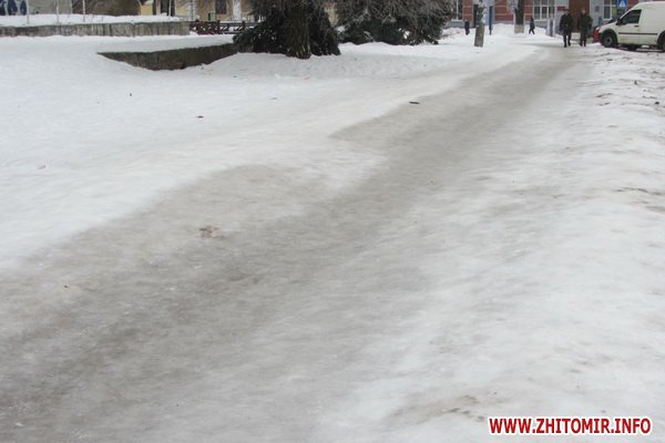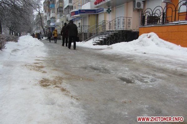 Утром 22 января в Житомире тротуары и дороги во дворах домов похожи на залитый каток. Кое-где ледяную корку присыпали песком, некоторые сознательные владельцы посыпают тротуар перед своим заведение солью, которая «разъедает» лед до самого асфальта, а те, у кого нет ни песка ни соли обходятся обычной землей.