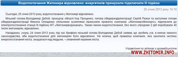 «Сегодня, 25 января 2013 года, водоснабжения в Житомире возобновлено. Мэр Владимир Дебой, прокурор области Игорь Проценко, губернатор Сергей Рыжук и его заместитель Николай Олещенко совместными усилиями заставили частную компанию «Житомироблэнерго» подключить к электроснабжению станции III подъема КП «Житомирводоканал». Таким образом водоснабжения, без которого в течение 2 суток находились 46 тысяч житомирян, восстановлено», - информирует управление по связям с общественностью Житомирского горсовета.