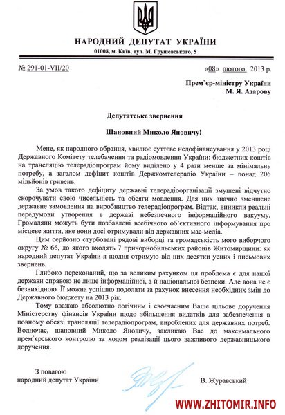 Народний депутат від Житомирської області Віталій Журавський написав депутатське звернення прем’єр-міністру України Миколі Азарову з проханням збільшити фінансування державних телерадіокомпаній.