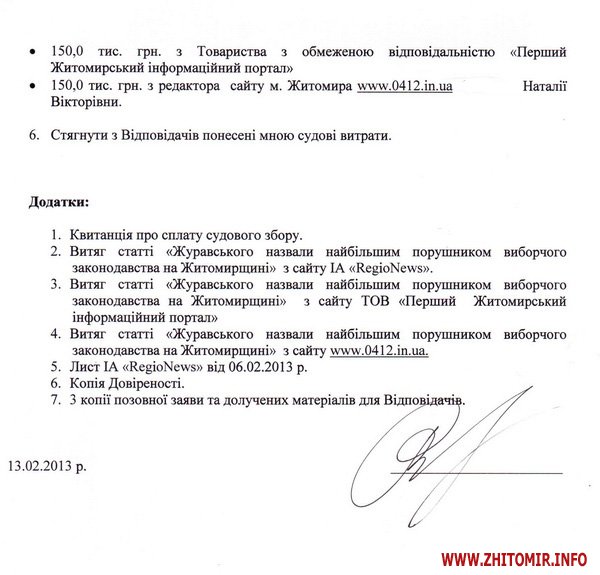У своєму позові народний обранець просить «визнати недостовірною та такою, що принижує честь, гідність та ділову репутацію інформацію, розповсюджену 6 лютого 2013 року в статті під назвою «Журавського назвали найбільшим порушником виборчого законодавства на Житомирщині» на сайтах Інформаційного Агентства «RegіoNews», ТОВ «Перший Житомирський інформаційний портал» та 0412.in.ua».