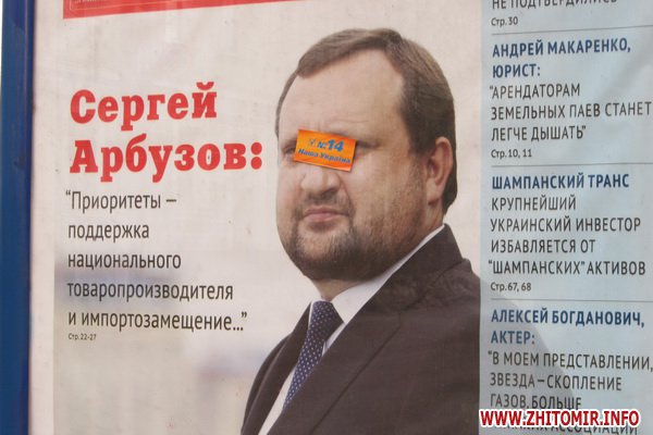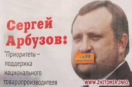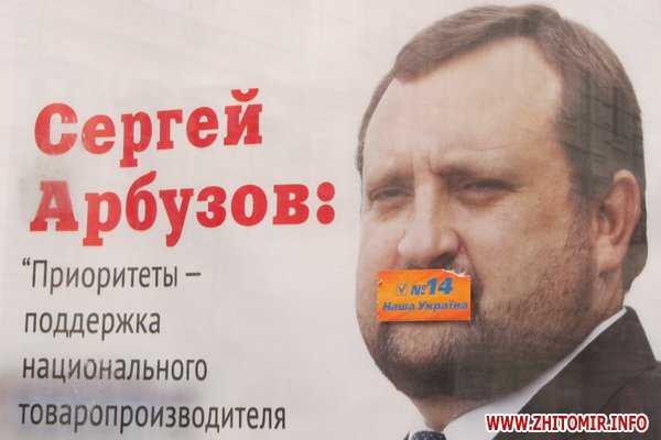 В центре Житомира неизвестные наклеили на сити-лайты с портретом первого вице-премьера Сергея Арбузова наклейки партии Ющенко «Наша Украина».
