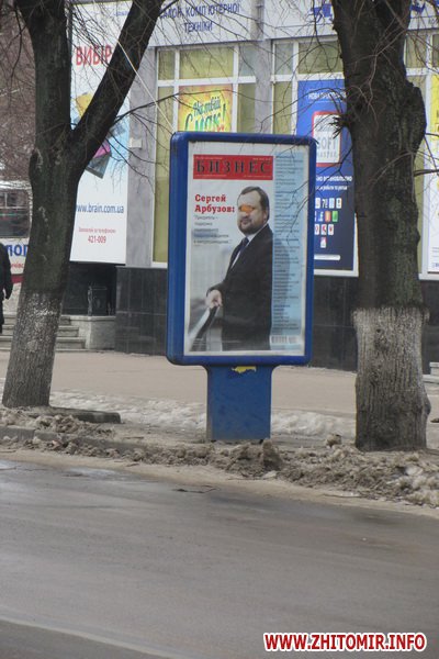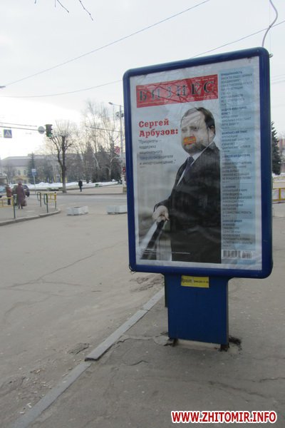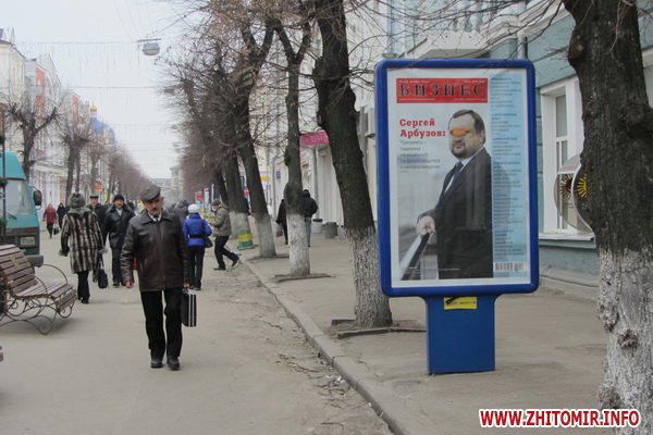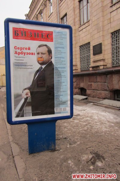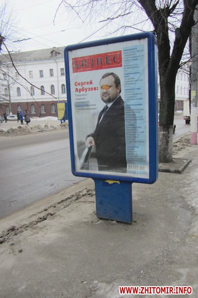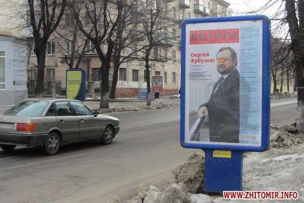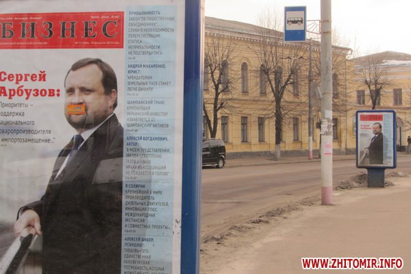 Недавно несколько десятков сити-лайтов с рекламой еженедельника «Бизнес» появились на центральных улицах Житомира. На обложке журнала – портрет бывшего главы Нацбанка, а ныне – первого вице-премьер-министра Украины Сергея Арбузова и заголовок его интервью изданию: «Приоритеты – поддержка национального товаропроизводителя и импортозамещение…».