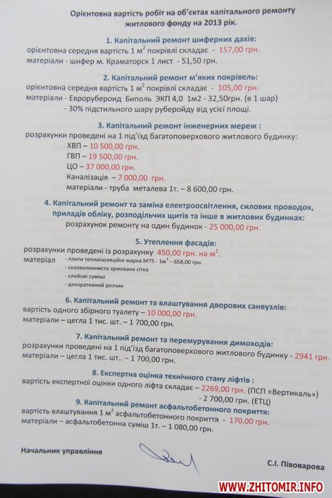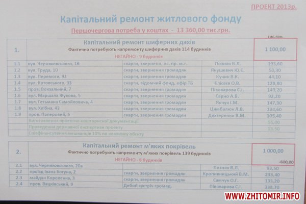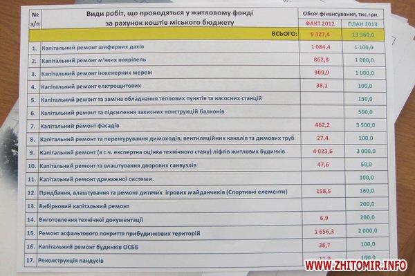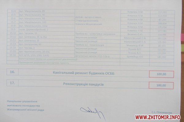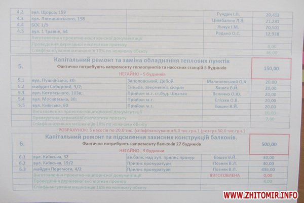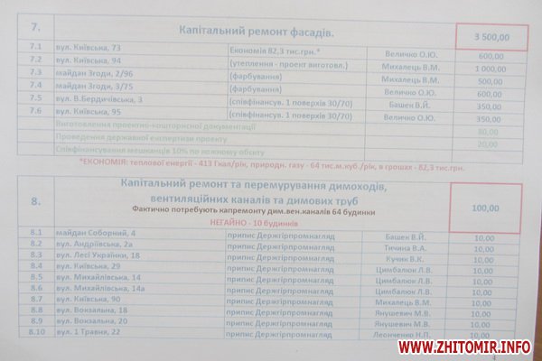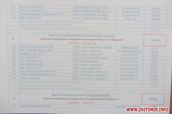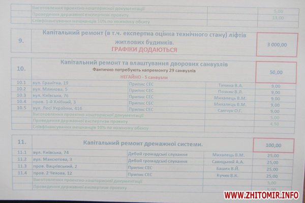 Данные о том, какие потребности являются первоочередными и как будут распределены бюджетные деньги, были розданы начальником управления жилищного хозяйства Житомирского горсовета Светланой Пивоваровой членам бюджетной комиссии 26 февраля.