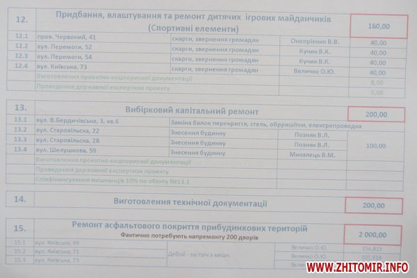 Причины для включения объектов в списки «первоочередников» указаны в таблицах: жалоба, обращение, прием граждан мэром Владимиром Дебоем, предписание прокуратуры, СЭС и т.п. Также возле каждого адреса указана фамилия депутата-мажоритарщика Житомирского горсовета, на округе которого находится данный объект. На отдельной странице указана ориентировочная стоимость работ и строительных материалов.