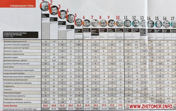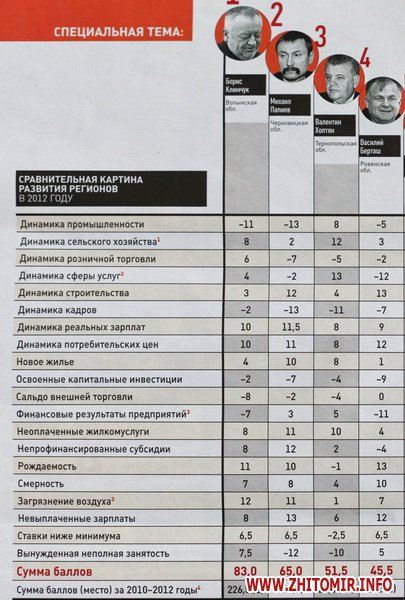«На 16-м месте (–1 балл) закончил прошлый год губернатор Житомирщины Сергей Рыжук, хотя по итогам 2011-го вверенная его заботам область находилась среди лидеров (на шестом месте). Наиболее заметно ухудшились динамика строительства и освоенные капитальные инвестиции; по этим критериям область переместилась соответственно с четвертого на 24-е и с девятого на 27-е (последнее) места. В 2012 году Житомирская область стала предпоследней по динамике розничной торговли, вошла в пятерку отстающих по уровню смертности, в шестерку регионов, допустивших наибольшую задолженность местных бюджетов по субсидиям перед организациями, предоставляющими ЖКУ, и в семерку отстающих по динамике сферы услуг. Вместе с тем есть у области и достижения, главное из которых — первое место по динамике промышленности (прирост на 16,6%). Уже второй год подряд на Житомирщине ударными темпами развивается добывающая промышленность, представленная в регионе предприятиями по добыче гранита, строительного камня, щебня и других стройматериалов (в 2012-м по сравнению с 2011-м прирост составил 52,8%, а в 2011-м по сравнению с 2010-м — 72%). К тому же область вошла в тройку лидеров по динамике сельского хозяйства (прирост на 9,5%) и заняла шестое место по динамике потребительских цен (годовая дефляция составила 0,5%)