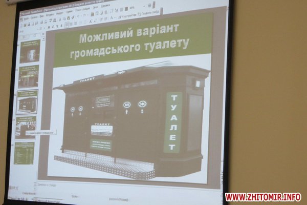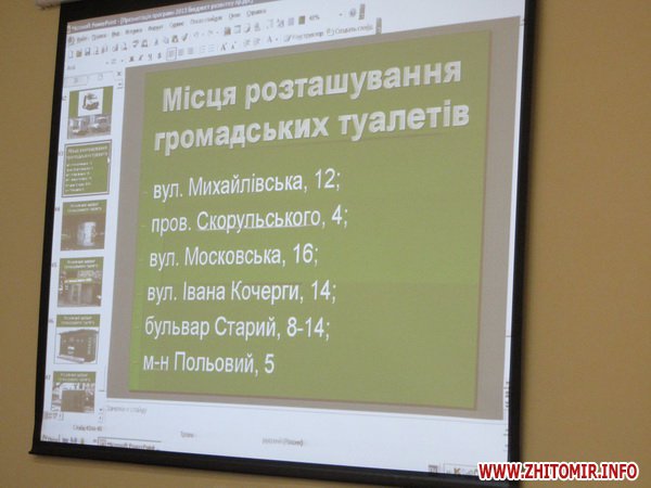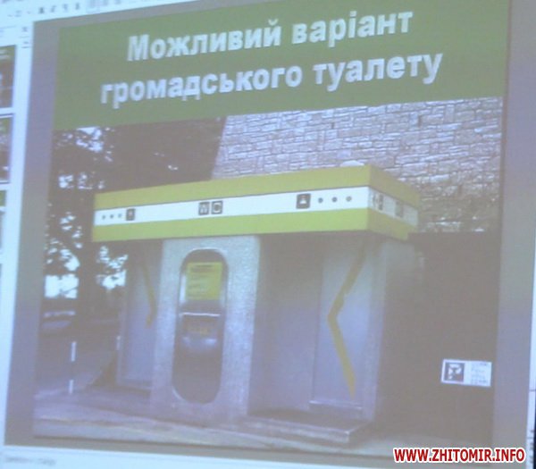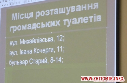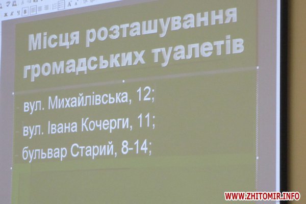 19 марта начальник управления коммунального хозяйства Житомирского горсовета Александр Марцун представил депутатам шесть мест, где запланировано установить общественные туалеты за средства бюджета развития: ул.Михайловская, 12; переулок Скорульского, 4; ул.Московская, 16; ул.И.Кочерги, 14; Старый бульвар 8-14; площадь Полевая, 5.