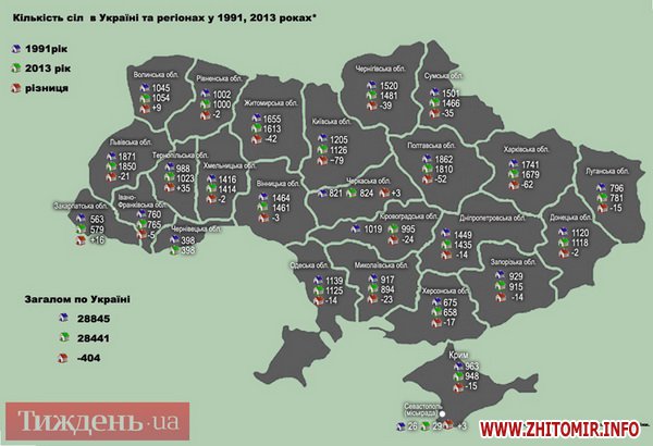 Найбільше за роки Незалежності вимерло сіл на Київщині (94), Полтавщині (55), Житомирщині (45), Сумщині (45), Харківщині (42), Чернігівщині (40).