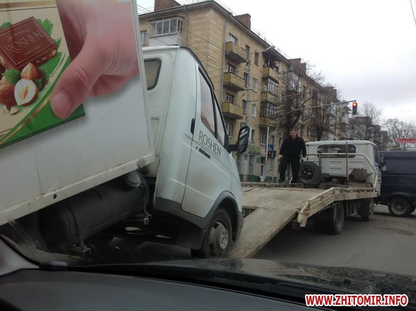 Грузовик "Газель" с фургоном, брендированный одной из кондитерских фабрик Украины, фактически разломался посреди перекрестка, усложнив движение транспорта.