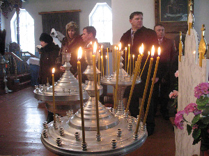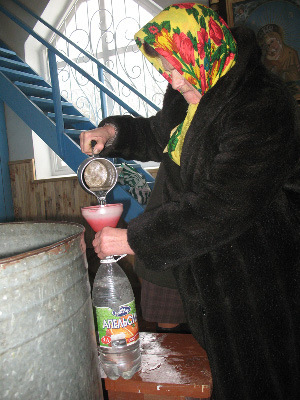 При входе в церковь стоит большой чан со святой водой.