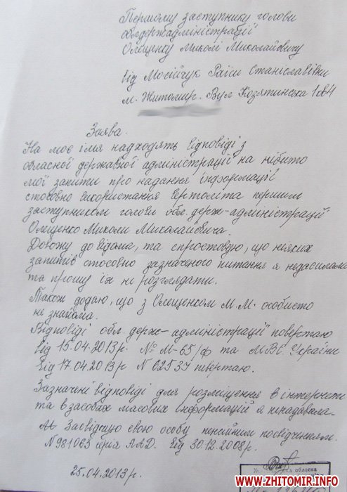 На самом деле пенсионерка Раиса Станиславовна Мосийчук, от чьего имени направлялся запрос, ничем подобным не интересовалась, с Олещенко лично не знакома и ответы, полученные из облгосадминистрации, для публикации в СМИ не предоставляла. Об этом Мосийчук собственноручно написала в заявлении на имя первого заместителя губернатора 25 апреля.